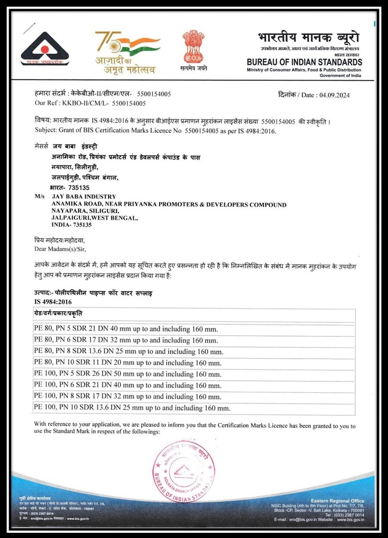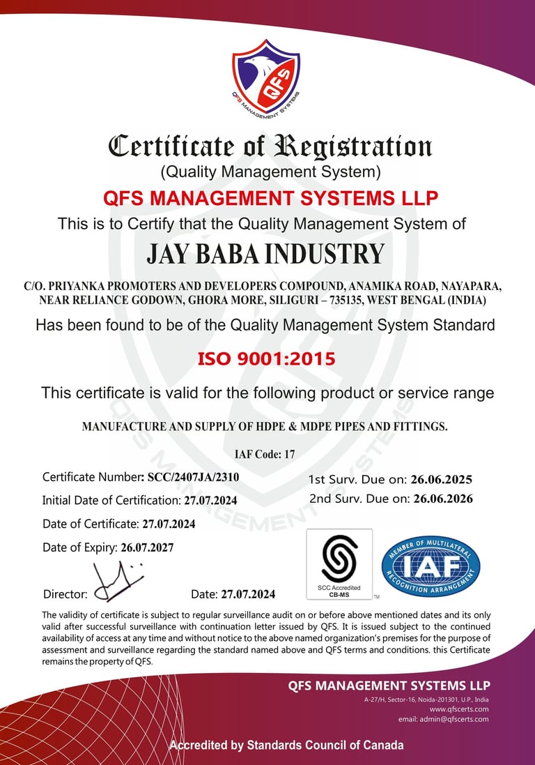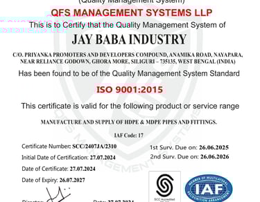 At JAY BABA INDUSTRY, quality is our top priority. Every pipe undergoes rigorous testing and quality checks to ensure compliance with ISI, ISO, and other relevant international standards. We are committed to continuous innovation, environmental responsibility, and customer satisfaction.